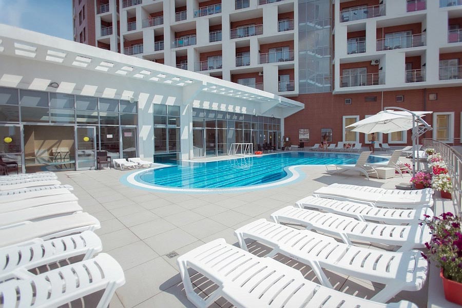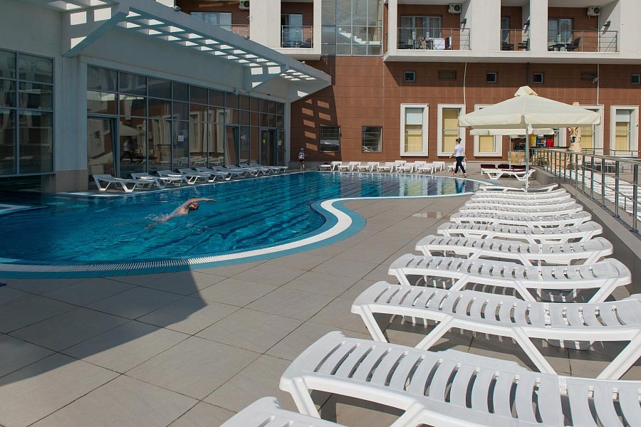 Просторный открытый бассейн имеет площадь 104 кв.м. и находится возле главного корпуса. Температура воды в нем около 27 градусов, а глубина составляет от 1,9 до 2,2 метров.